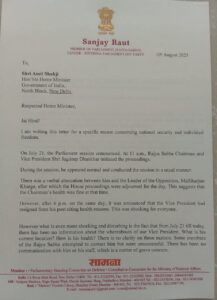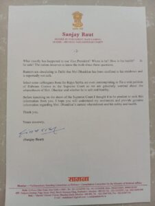 उपराष्ट्रपती जगदीप धनखड हे बेपत्ता असल्याच्या बातम्या येत आहेत, ते राज्य सभेचे सभागृहाचे अध्यक होते पदाचा राजीनामा दिल्यानंतर ते गायब आहेत अशा बातम्या वजा अफवा पसरल्या आहेत त्यामुळे शिवसेना ठाकरे गटाचे नेते खा. संजय राऊत यांनी गृहमंत्री अमित शहा यांना पत्र लिहून चिंता व्यक्त केली आहे. जगदीप धनखड नेमके कुठे आहेत हे देशात सांगा अशी म्हणी अमित शहा यांच्याकडे पत्राद्वारे संजय राऊत यांनी केली आहे.
